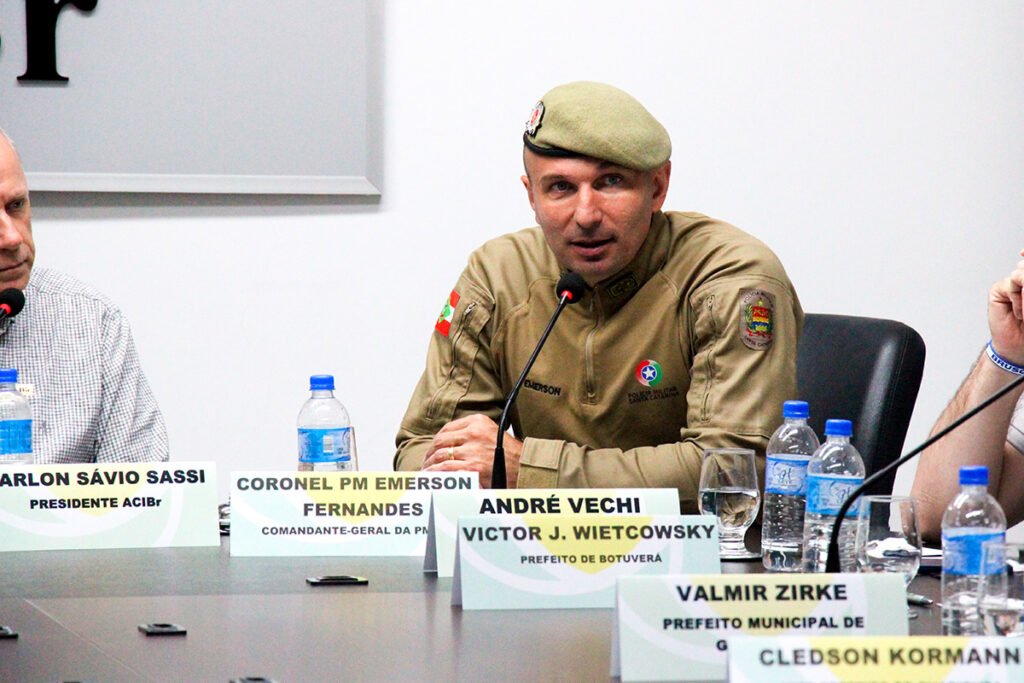 O comandante-geral da Polícia Militar de Santa Catarina, coronel Emerson Fernandes, destacou a previsão de um reforço histórico no efetivo de Brusque durante o encontro | Foto: Amabile Nazário / Ideia Comunicação