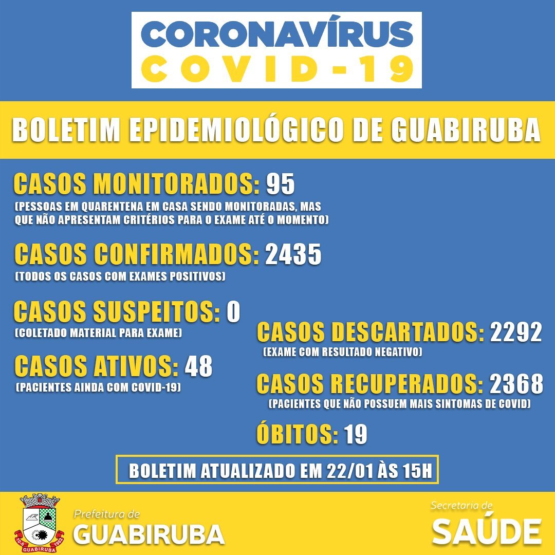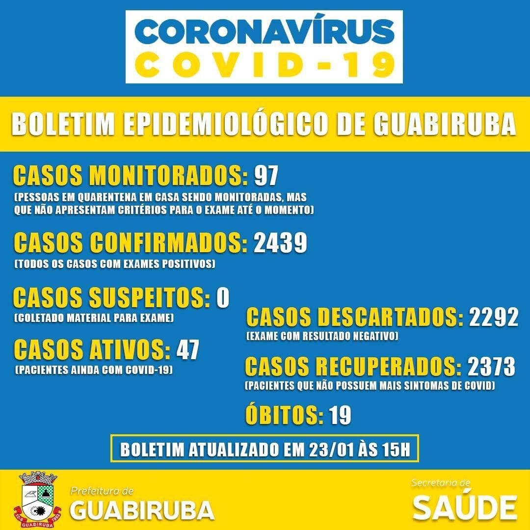 No sábado (23), quatro novos casos foram confirmados de Covid-19 pelo teste Antígeno e em laboratório particular, sendo de três mulheres e de um homens. Ao total, Guabiruba já registrou 2.439 casos de Covid-19, destes, 2.373 estão recuperados e 47 estão ainda ativos.