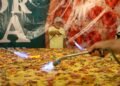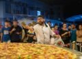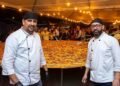 Ele explica que foi preparada uma plataforma com chapa de alumínio, onde a massa foi esticada e assada. “Trouxemos ela batida e fermentando. A pizza foi assada com maçarico”, completa. “Foi a primeira vez que fizemos uma pizza tão grande”, emenda Alex.